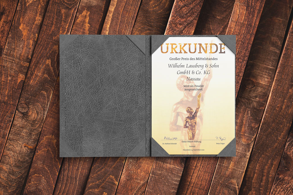 Wir freuen uns über die Benennung als Wettbewerbsteilnehmer durch die IHK Geschäftsstelle Montabaur und die Nominierung und Auszeichnung zum Finalisten in RLP durch die Oskar Patzelt-Stiftung beim Großen Preis des Mittelstandes am 24.09.2022! Aus 599 Nominierten wurde unser Familienunternehmen als einer von 6 Finalisten ausgezeichnet und darauf sind wir sehr stolz!